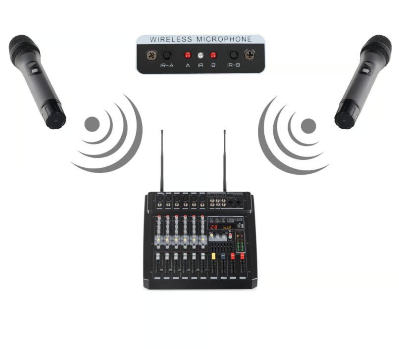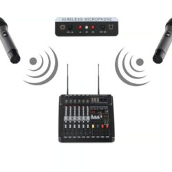2 Funkmikrofone und im Mixer integrierter UHF-Empfänger